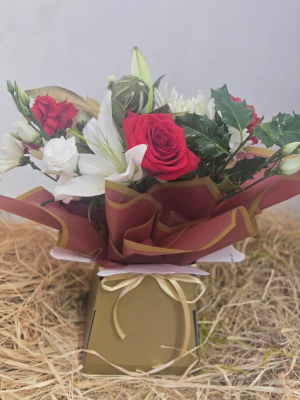 A beautiful Christmas aqua arrangement made of lovely fresh festive flowers and greenery, flowers may vary from the photo, but will always be similar